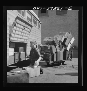 A Greyhound bus driver loading baggage at a small town between Chicago, Illinois and Cincinnati, Ohio