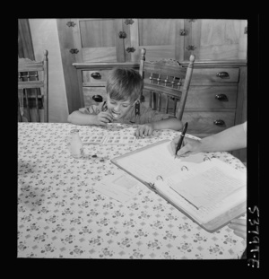 East Montpelier, Vermont. Richard, age five, son of Charles Ormsbee, shown with his mother, is licking savings stamps, a self-selected war project. All his family contribute in special ways to the war effort