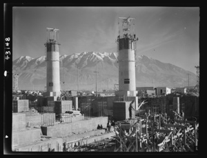 Columbia Steel Company at Geneva, Utah. Partly finished open hearth furnaces and stacks for a new steel mill under construction which will soon be producing vitally needed steel