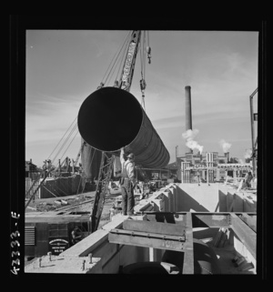 Columbia Steel Company at Geneva, Utah. Setting a pipe with a derrick during the construction of a new steel mill which will make important additions to the vast amount of steel needed for the war effort