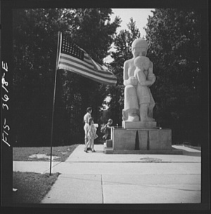 Greenbelt, Maryland. Roy Braden, manager of the town, gives a patriotic speech on Memorial Day. On the platform are members of the town womens' club