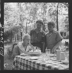 Greenbelt, Maryland. Grandma Taylor blows out the candles on her eighty-third birthday cake while her daughter, Mrs. McCarl, and grandson look on