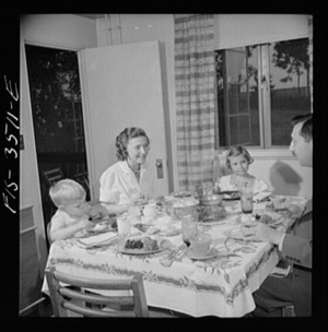 Greenbelt, Maryland. Federal housing project. Mr. and Mrs. Leslie Atkins, Ann, and Pierce Atkins having supper