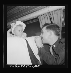 A lieutenant getting acquainted with one of the passengers on a Greyhound bus enroute from Cincinnati, Ohio to Louisville, Kentucky. He makes this trip almost every weekend to visit relatives