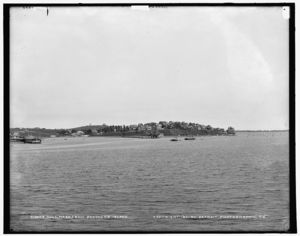 Boston Light and Hotel Pemberton from Paddock's Island, Hull, Mass.