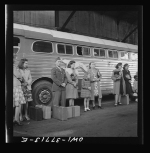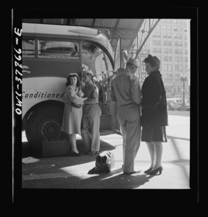 Indianapolis, Indiana. Soldiers with their girls in front of the Greyhound bus