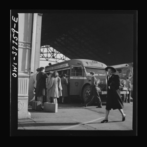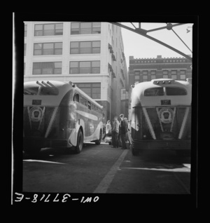Indianapolis, Indiana. An old-type bus being boarded by passengers in the Greyhound bus terminal. The drivers call this type of bus a "dive bomber." These buses are about ten years old and have been completely rebuilt