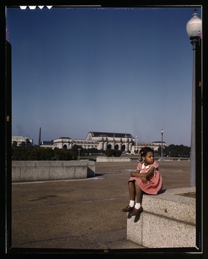 Little girl in a park with Union Station in the background, Washington, D.C.