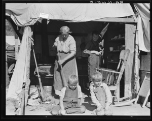 Tom Collins, manager of Kern migrant camp talking with drought refugee and her four sons. California
