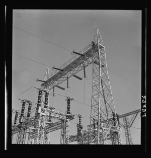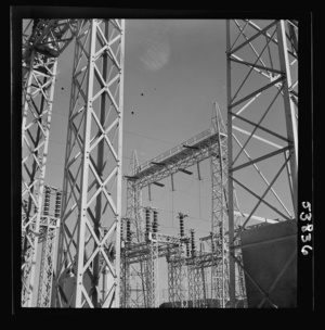 Las Vegas, Nevada. A mass of transmission towers and transformers redistributing power from Boulder Dam to Basic Magnesium Incorporated, which produces huge quantities of the lightest of all metals for aircraft and other wartime manufacturing