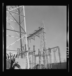 Las Vegas, Nevada. Transmission towers and transformers redistributing power from Boulder Dam to Basic Magnesium Incorporated, which produces huge quantities of the lightest of all metals for aircraft and other wartime manufacturing