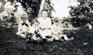 Sallie Moore Short and her nieces Kitty, Mary Lois, and Martha playing in the leaves on the Moore...