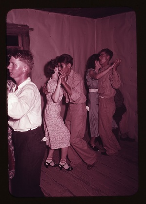 Orchestra during intermission at square dance; notice sweated shirt of host, McIntosh County, Oklahoma
