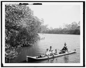 Seminole Indian and family dugout canoe, Miami, Fla.