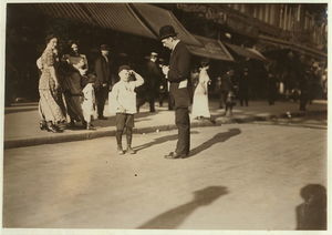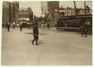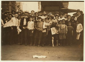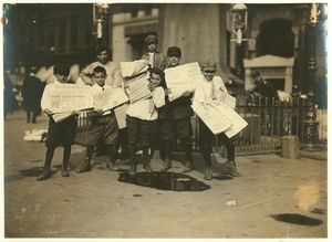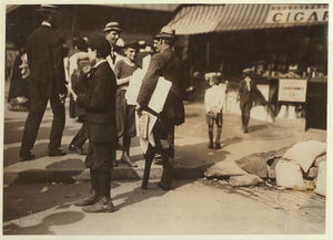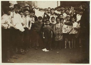 Newsboys and newsgirl. (Mary Malchade) (9 years old.) Getting afternoon papers, Park Row. Location: New York, New York (State)