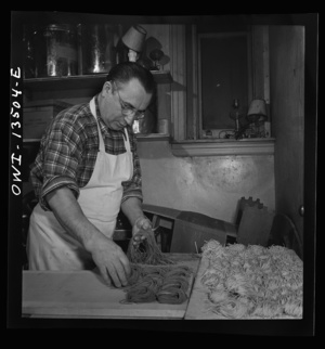 New York, New York. Laying out portions of freshly-made green and white noodles in the kitchen of the Sixty-Eight restaurant on Fifth Avenue at Thirteenth Street. Each pile represents a portion