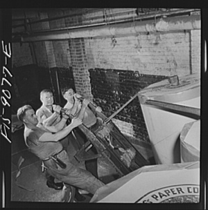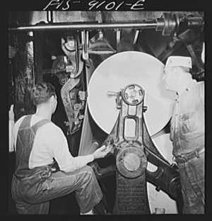 New York, New York. Reel room of the New York Times newspaper. In threading paper through presses two rolls of paper are pasted together by automatic paster so that presses never stop moving