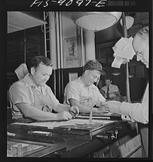 New York, New York. Composing room of the New York Times newspaper. Making up the sport page