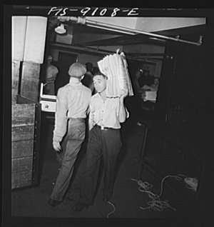 New York, New York. Mailroom of the New York Times newspaper. Bundles of papers are carried to trucks for distribution