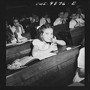New York, New York. Janet Winn or Wynn, a Czech-American child, having mid-morning milk in public school; it costs five cents a week