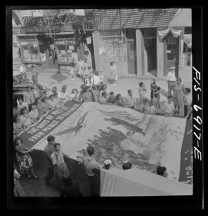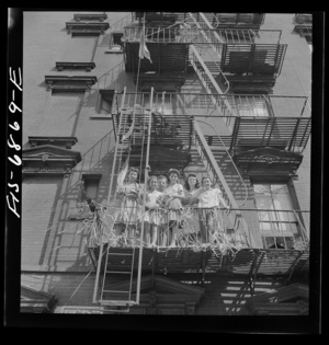 New York, New York. Italian-Americans of Mott Street raising a flag in honor of neighborhood boys in the United States Army