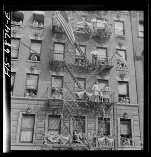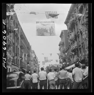 New York, New York. Italian-American watching parade on Mott Street and flag raising ceremony in honor of boys from the neighborhood in the United States Army
