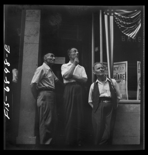 New York, New York. Italian-Americans in the rain watching a flag raising ceremony in honor of neighborhood boys in the United States Army