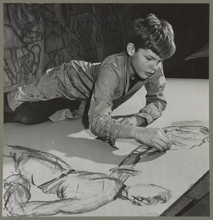 New York, New York. The Lincoln School of Teachers' College, Columbia University. Sixth-grade pupil sketching out a mural of football players to be used as a decoration for the hallway in the school designated as an air raid shelter