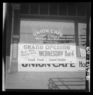 Opening of union cafe. Oakland, California. Photograph made day after 1936 Presidential election