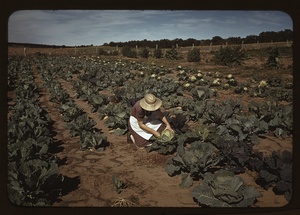 Mr. Leatherman, homesteader, tying up cauliflower, Pie Town, New Mexico