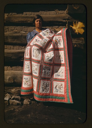 Mrs. Bill Stagg with state quilt which she made, Pie Town, New Mexico