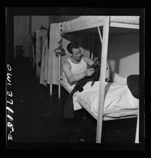 A Greyhound bus driver dressing in the dormitory at the garage. This is for the use of drivers living in another town but have their layover time in Pittsburgh