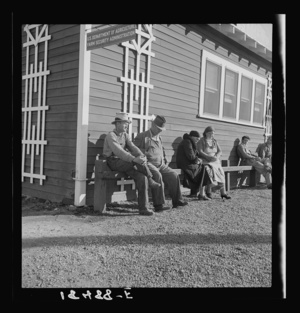 Lineup outside of Farm Security Administration grant office (relief to farm laborers) early in the morning, before the office has opened. Tulare, California
