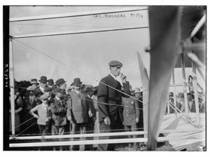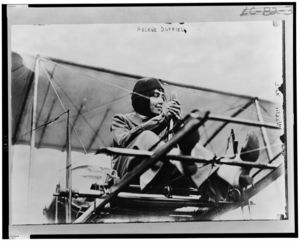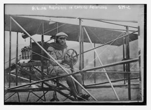 F.L. de Riemsdyk at pilot wheel of Curtiss aeroplane