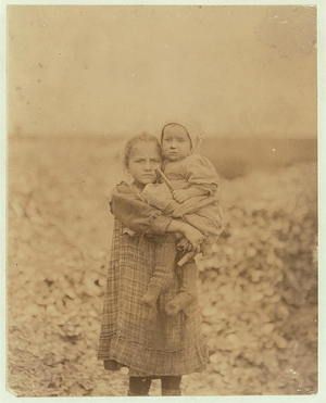 Ten-year old Sophie "tending the baby," between her jobs of shucking. Maggioni Canning Co. Location: Port Royal, South Carolina.
