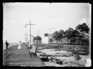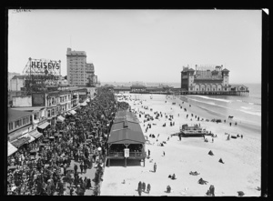Beach and crowded boardwalk with vaudeville theater onpier, possibly Atlantic City, N.J.