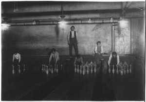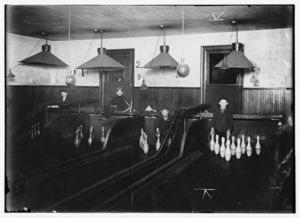 Bowling Alleys, connected with Geo. P. Grays, "Bastable Caf " on Genesee St. About 8 very small boys employed here. Work until midnight. Photo taken at 11:30 P.M. Location: Syracuse, New York (State)