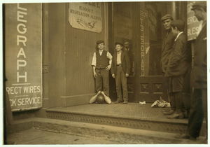 1:00 A.M. Pin boys working in Subway Bowling Alleys, 65 South St., B'klyn, N.Y. every night. 3 smaller boys were kept out of the photo by Boss. Location: New York--Brooklyn, New York (State)