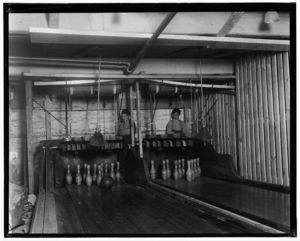 Photo of boys working in Arcade Bowling Alley. Trenton, N.J. Photo taken late at night. The boys work until midnight and later. Dec. 20, 1909. Location: Trenton, New Jersey