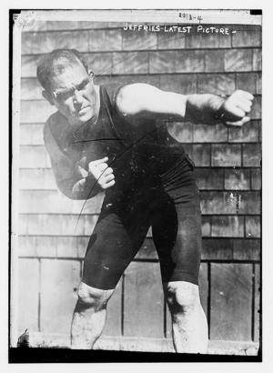 James J. Jeffries, head-and-shoulders portrait, facing left, shown listening to Sam Berger at left