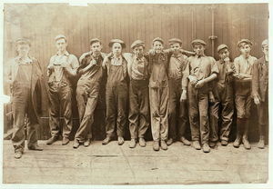 A Group of Young Fellows Working in a Cannery, In Indianapolis, Aug., 1908. Location: Indianapolis, Indiana.