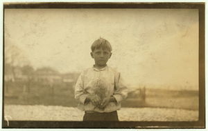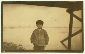 Joe Davis, a ten-year old going home from cannery at 5 P.M. He said he had shucked ten pots since 4 A.M. that day. Location: Pass Christian, Mississippi / L.W. Hine.