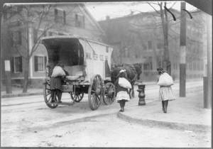 Horse-drawn ice wagon and several persons, two with blocks of ice, standing in street in front of residence