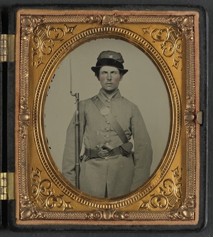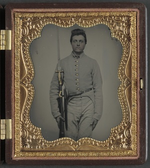 Private Parris P. Casey of Company I, "Cherokee Rangers," 19th Alabama Infantry Regiment, with bayoneted musket