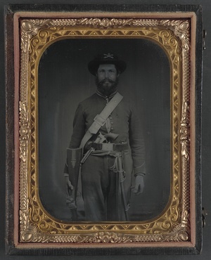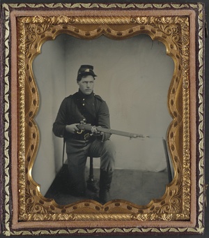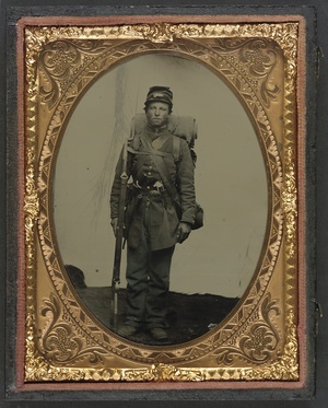 Unidentified soldier in Union uniform with bayoneted musket, revolver, and knapsack