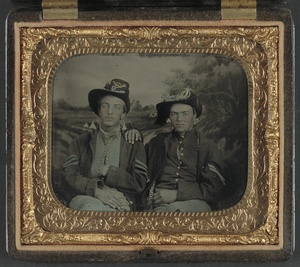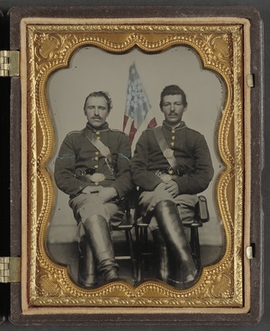 Unidentified sergeant and corporal in Union uniforms in front of painted backdrop showing camp scene