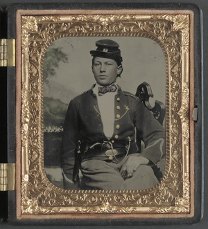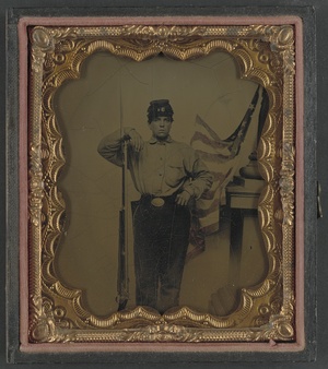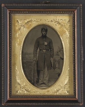 Sergeant Tom Strawn of Company B, 3rd U.S. Colored Troops Heavy Artillery Regiment, with revolver in front of painted backdrop showing balustrade and landscape