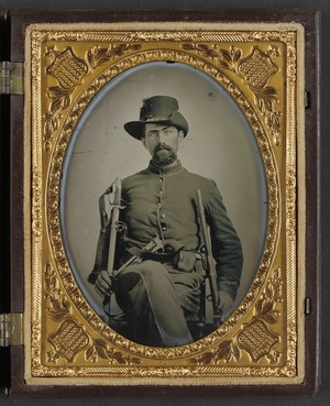 Unidentified soldier in New Hampshire uniform and Co. D Whipple hat with bayoneted musket and revolver