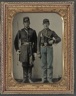Unidentified soldier in Union cavalry uniform with banjo, sword, and pipe