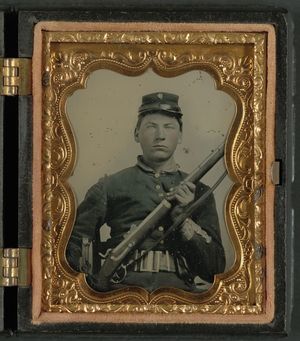 Unidentified soldier in Union uniform and rifleman's belt rig with musket
